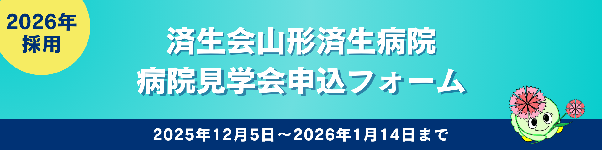 | 申込方法 | 次の何れかの方法で、参加日の前々平日までにお申し込みください ①マイナビ2026より 山形済生病院「説明会・セミナー」からお申し込みください ②Googleフォームより 下のバナーからフォームにアクセスいただきお申込みください ![]() |
